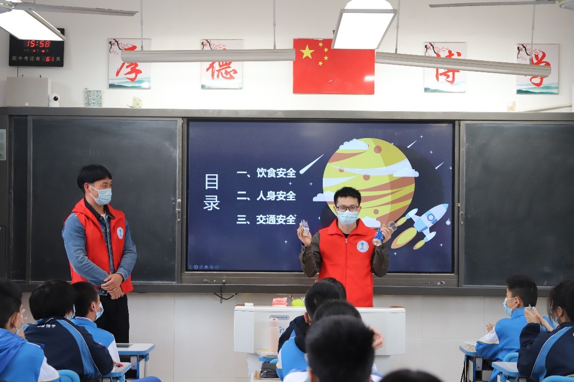 4月18日下午,“安全教育进校园”志愿活动顺利拉开序幕。志愿者们在孙瀚老师的带领下整齐有序的进入校园,党支部书记吴照浩给各组志愿者们分配了宣讲班级和宣讲纪念品,志愿者们陆续进入各自负责的班级。志愿者们分别从饮食安全、人身安全、交通安全三个方面展开宣讲,同学们全神贯注地听讲、并积极进行互动,课堂气氛非常活跃。宣讲结束后,同学们纷纷表示在此次教育活动受益匪浅,学习到了很多有用的安全知识。