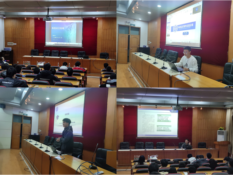博士研究生陈永俊、郭腾飞、史瞻銘和硕士研究生张炳一四位同学为同学们分享科研论文写作经验和科研心得。