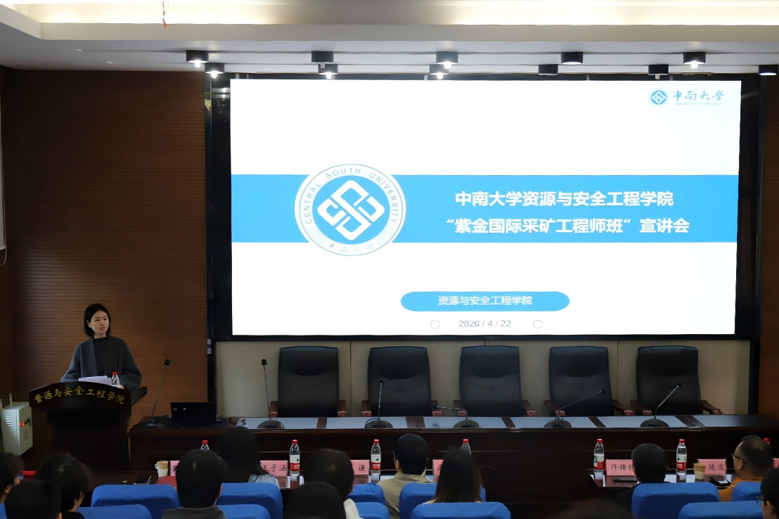 4月22日下午15时,紫金国际采矿工程师班宣讲会在岳麓山校区采矿楼T302顺利举办。紫金(长沙)工程技术有限公司副总经理仵锋锋、静县备战矿业有限责任公司副总经理牟延波、紫金矿业集团人力资源部人才发展中心主任林晞、学院副院长黄锐、辅导员于谦、王子涵、黄佳星以及本科2025级采矿工程专业全体学生参加本次宣讲。