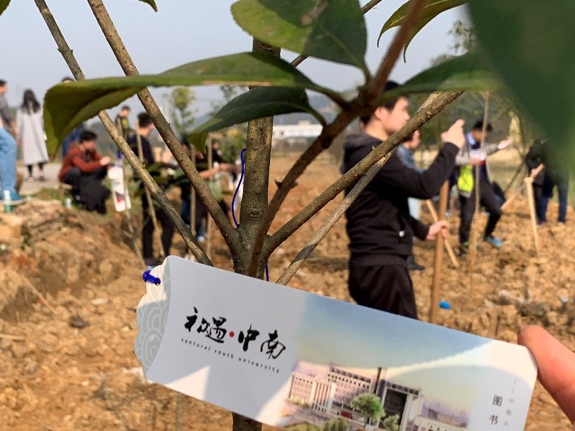 标志的树牌上写下祝福,并将树牌系在一颗颗刚刚被赋予新生命的树苗上。