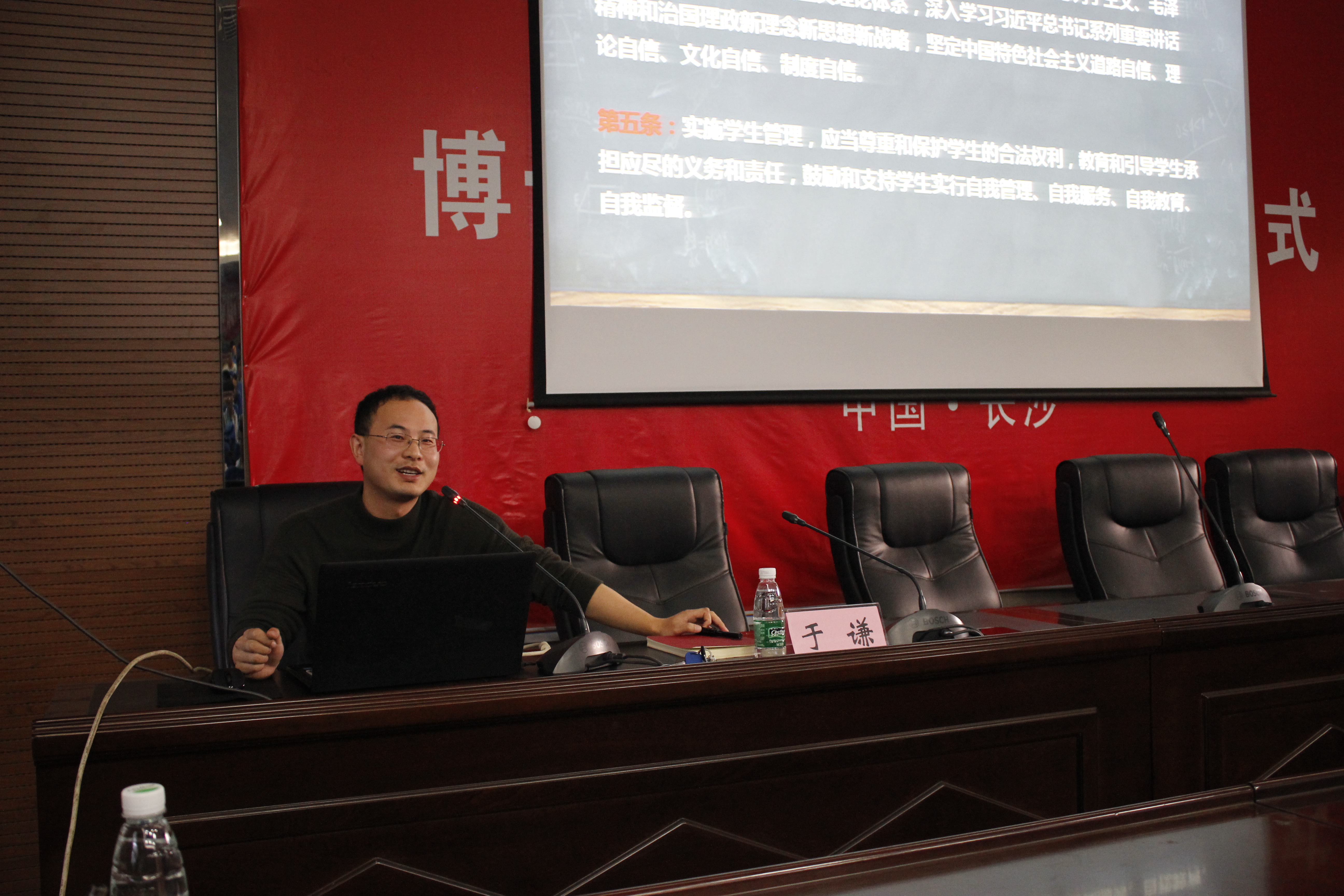 的校训、校风,诠释了社会主义核心价值观及《普通高等学校学生管理规定》的各项义务及要求,并希望在座的各位同学要谨记于心,恪守规章,做一个合格的中南人。此外,于老师特别强调了树立程序意识与规则意识的重要性。