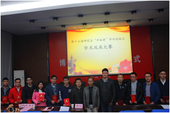 本次学术风采大赛获奖情况如下:尚雪义同学荣获一等奖;蔡鑫、王秉同学荣获二等奖;谢晓锋、吴浩、杨家彩同学荣获三等奖;欧阳秋梅、熊信、罗大有、涂鸿渐同学荣获优胜奖。