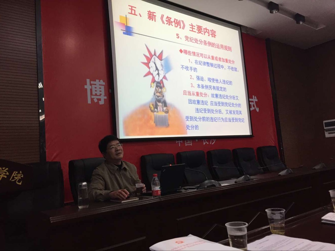 召开主题为“认真学习《中国共产党廉洁自律准则》和《中国共产党纪律处分条例》,自觉践行三严三实”的专题辅导报告会,学院党委李顺求书记作专题报告。学院院长周科平、党委副书记孙胜,以及全体党支部书记、支委、学生党员参与学习。报告会由学院党组织干事叶青主持。