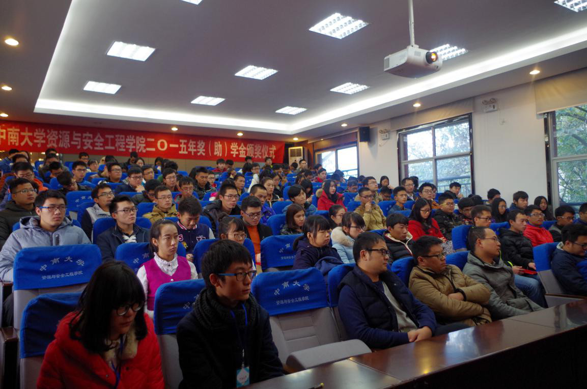 2015年奖(助)学金颁奖仪式在采矿楼302报告厅举行,江南化工副总裁赵海涛、副总工程师杨仕春、企管部部长林波,宏大爆破副总工程师崔晓荣及金诚信矿业管理公司人力资源中心总经理助理蒋海文等设奖企业代表应邀出席,学院党委书记李顺求、院长周科平、党委副书记孙胜以及院学工办辅导员、获奖学生代表共120余人参加了本次典礼。