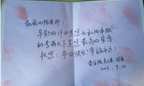 在教师节来临之际,在学院关工委主任、院党委副书记孙胜老师的带领下,院关工委秘书、分团委书记朱玮老师和学生代表,走访慰问了陈菊山、彭续承等学院关心下一代工作委员会的几位老教师,并通过贺卡、电子邮件、手机短信等多动方式,为学院关工委的老师们送上了一份暖暖的教师节祝福。