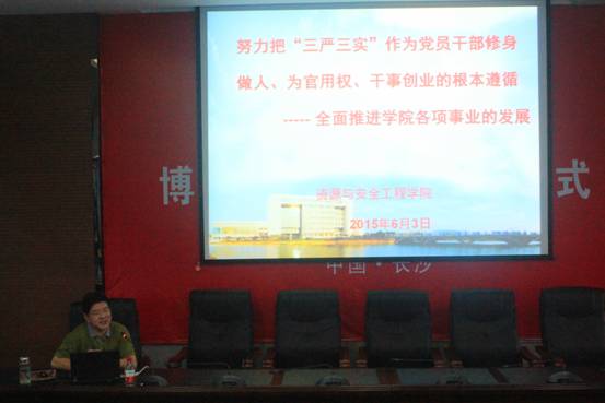 党委在采矿楼302报告厅举办“三严三实”专题教育党课。本次党课由院党委书记李顺求担任主讲,中国工程院院士古德生教授出席,资安院全体教职工党员、各系负责人、学生党支部支委和学院办公室行政人员参加学习。
