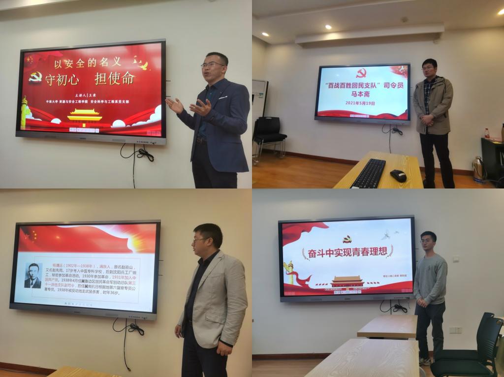比赛过程中,各位参赛党员既有慷慨陈词的激情演讲,也有婉转低回的动情诉说,讲述了一个个生动的党史人物:学院副院长李地元同志讲述了抗战英烈杨靖远烈士弃医从戎济世民,不破日寇不割髯 的英雄豪情;安全系青年教师王秉以《以安全的名义,守初心,担使命》为题,宣誓了安全工作者、科研者、教育者的担当和使命,以及为党育安全人才,为国育安全人才的坚强信念;来自新疆的维吾尔族学生党员哈米扎提·海米提讲述了自己民族的优秀党员、马克思主义的史学研究者翦伯赞的事迹,在先辈人格的感化和精神的指引下,更加坚定了各民族团结一心跟党走的信仰;学院教务员胡剑老师通过讲述“百战百胜回民支队”司令员马本斋的事迹,悟出“每个普通党员都应该立足自己的工作岗位为党和人民贡献自己的力量”。来自云南丽江的杨晓枭同学讲述了自己家乡的最美女校长张桂梅,献身贫困乡村教育事业的感人故事,令人感受到共产党员信仰的伟大力量。