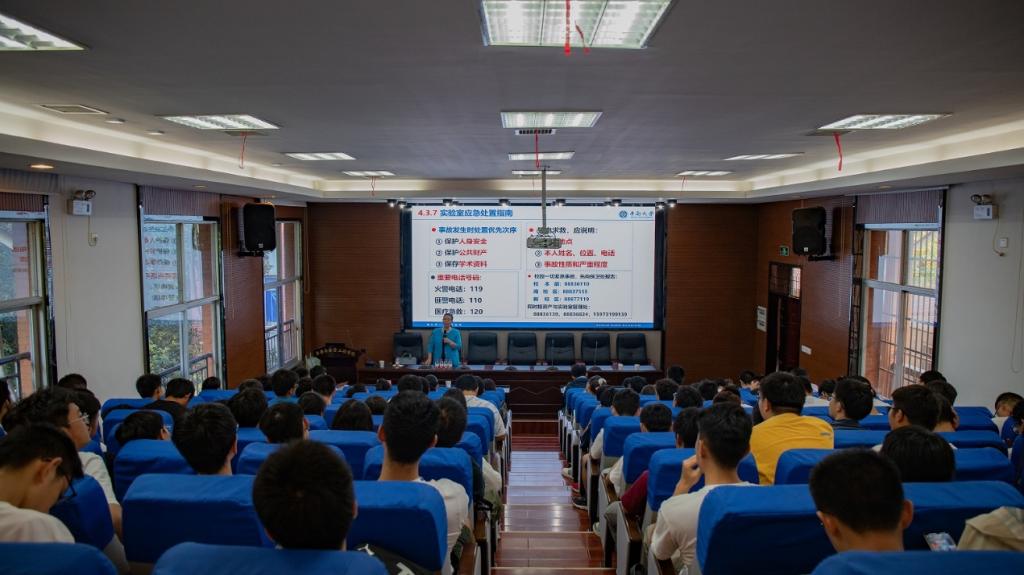 实验室安全与环保督导组组长罗一鸣教授主讲,培训会由学院党委书记欧旭理主持会议,学院分管教学实验室副院长尹土兵、教学实验中心全体老师,全体2022级新生参加了本次培训。