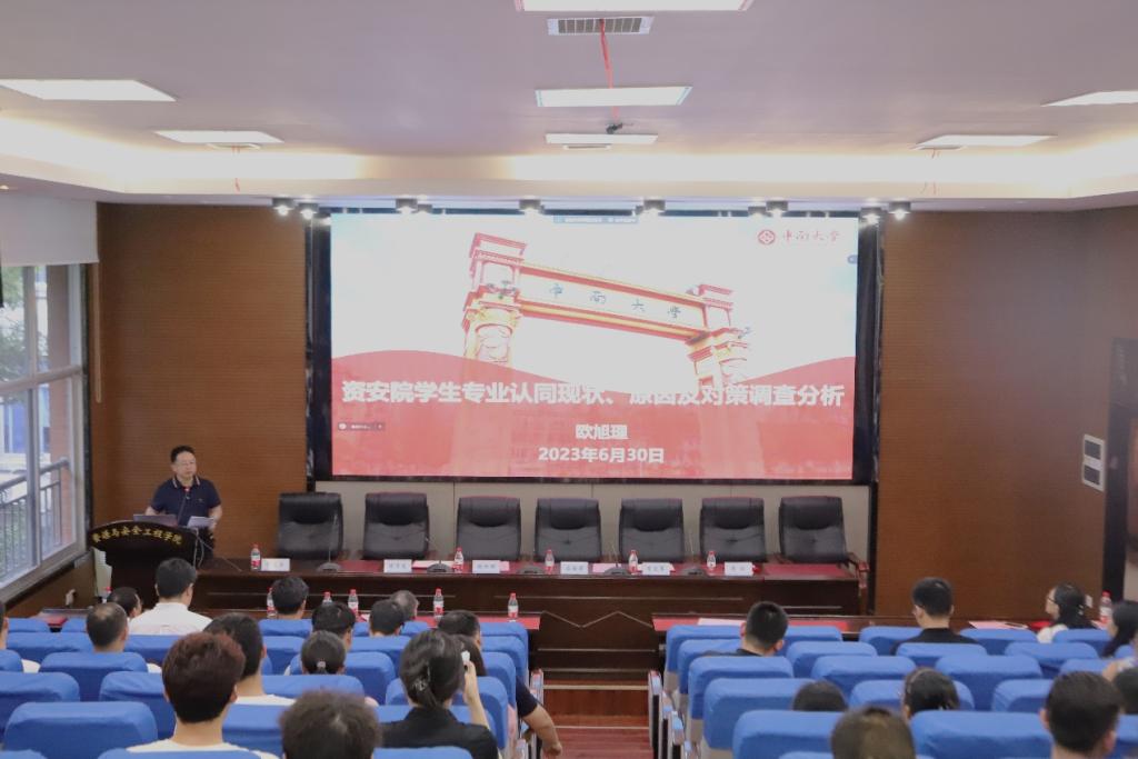 于采矿楼T302举办主题教育专题党课。学院党委书记欧旭理以《资安院学生专业认同现状、原因及对策调查分析》为题讲授专题党课。学校主题教育第四指导组张艳武到会指导,学院班子成员,各党支部书记、支委以及全体教职工党员参加此次大会。